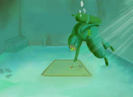 ダイバー姿になったおじいさんはパイプを探すため部屋の中央から潜っていきます。